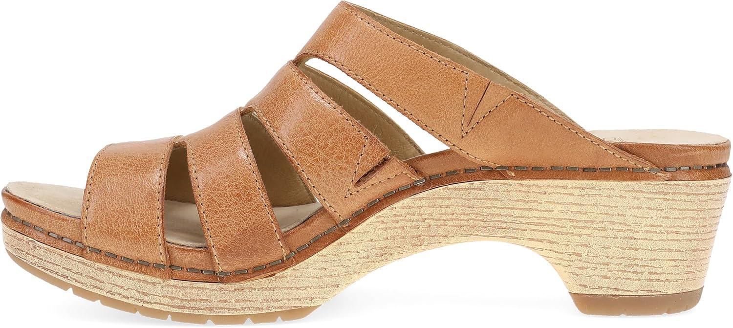The Dansko Lyndi is a multi-strap slide with high-quality leathers and a faux-wood sole to easily dress up or down. Featuring stapled construction, these sandals are designed with breathable suede socklining for excellent ventilation. In addition, the cushioned, energy-return PU footbed provides exceptional comfort and support. Nubuck leather upper treated with 3M Scotchgard for stain resistance. Leather lining. Block heel. Flexible, lightweight thermoplastic rubber outsole.