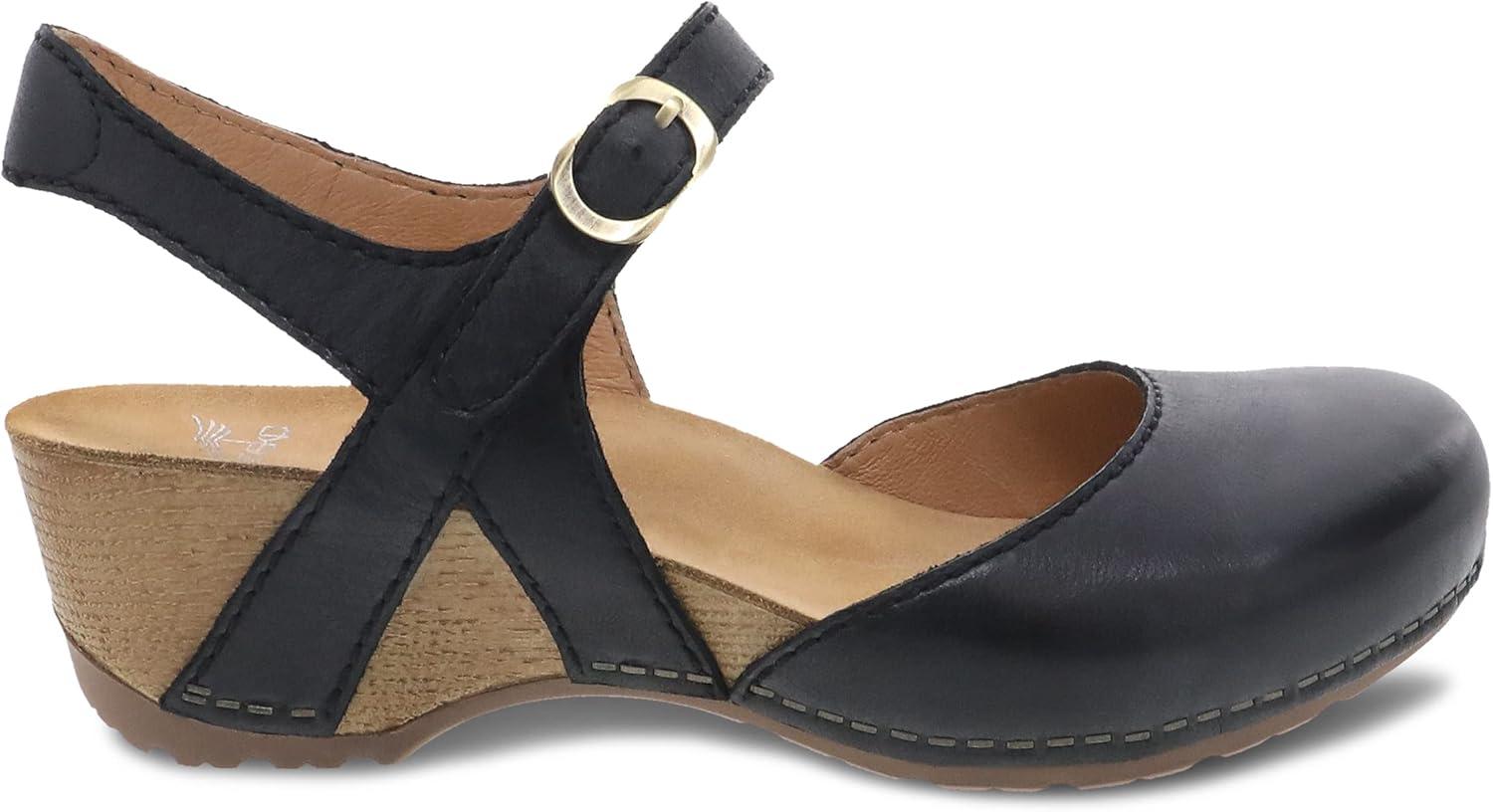 Dansko Tiffani Wedge Sandal for Women – Cushioned, Contoured Footbed for All-Day Comfort and Support – Hook & Loop Strap with Buckle Detail – Lightweight Rubber Outsole(Black)